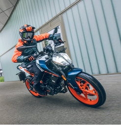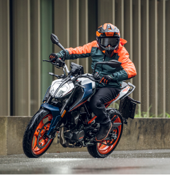 Lightweight yet stable, the 17" cast alloy wheels deliver confident power transfer. Wrapped in premium rubber, the pro-spec tires keep you KTM-glued to the road.